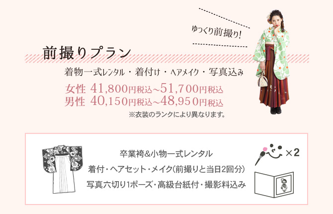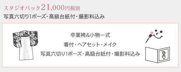 ハカマレンタルドットコムでお衣装をレンタル、パークスタジオでお支度&撮影をしていただくと、衣装の受取り返却を当店が代行いたします。
